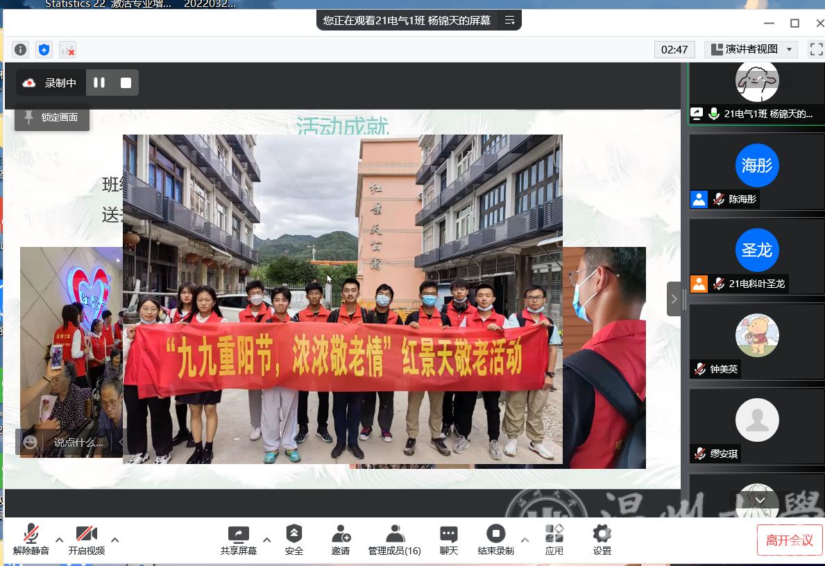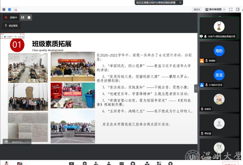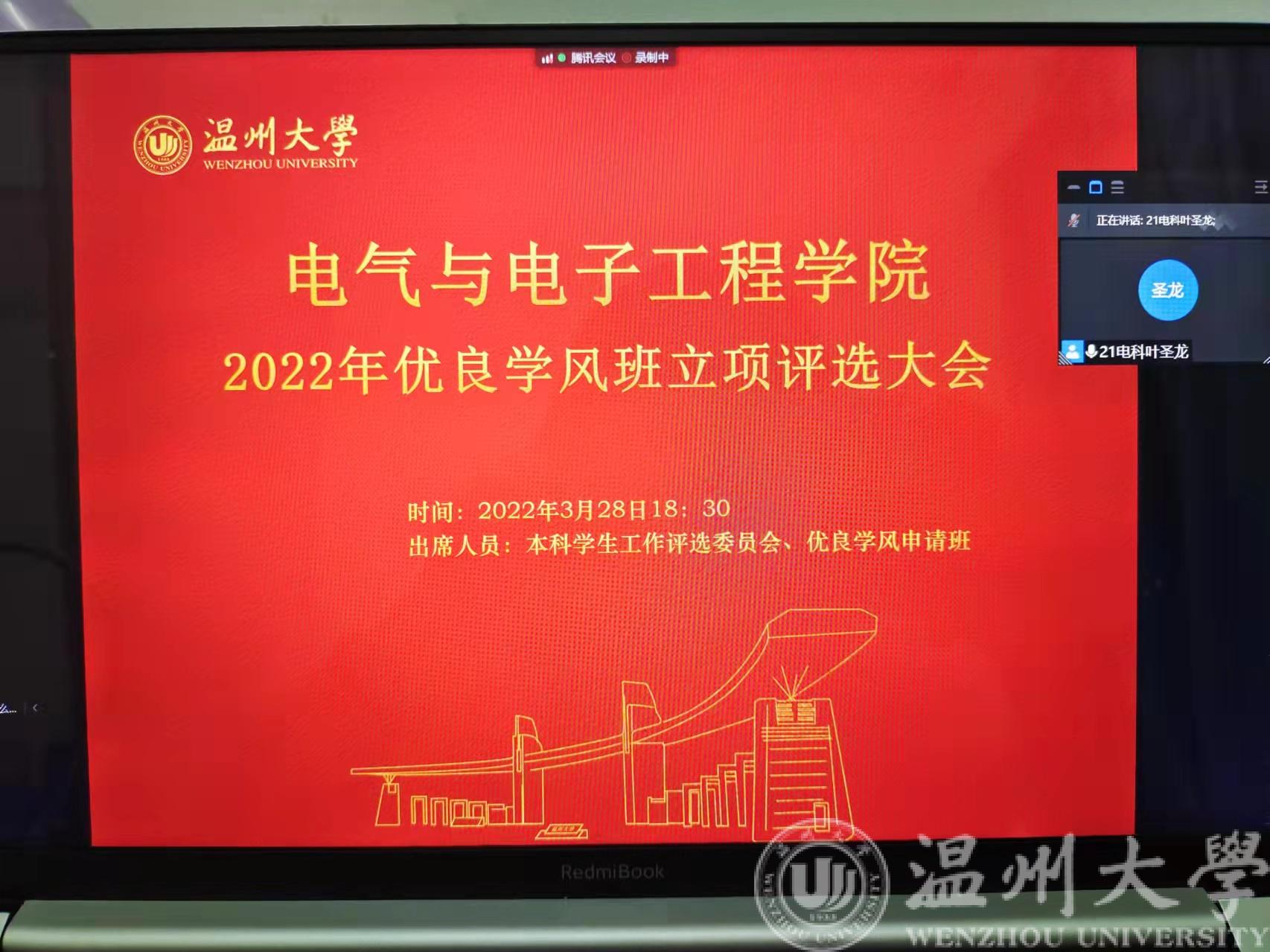 为进一步加强校风学风建设,树立优良学风,加大优秀班级的示范作用,黑料网 于2022年3月28日晚在线上举办“优良学风班”立项申请评选活动。学院本科生评选委员会委员以及申请立项的8个班级出席了本次活动。