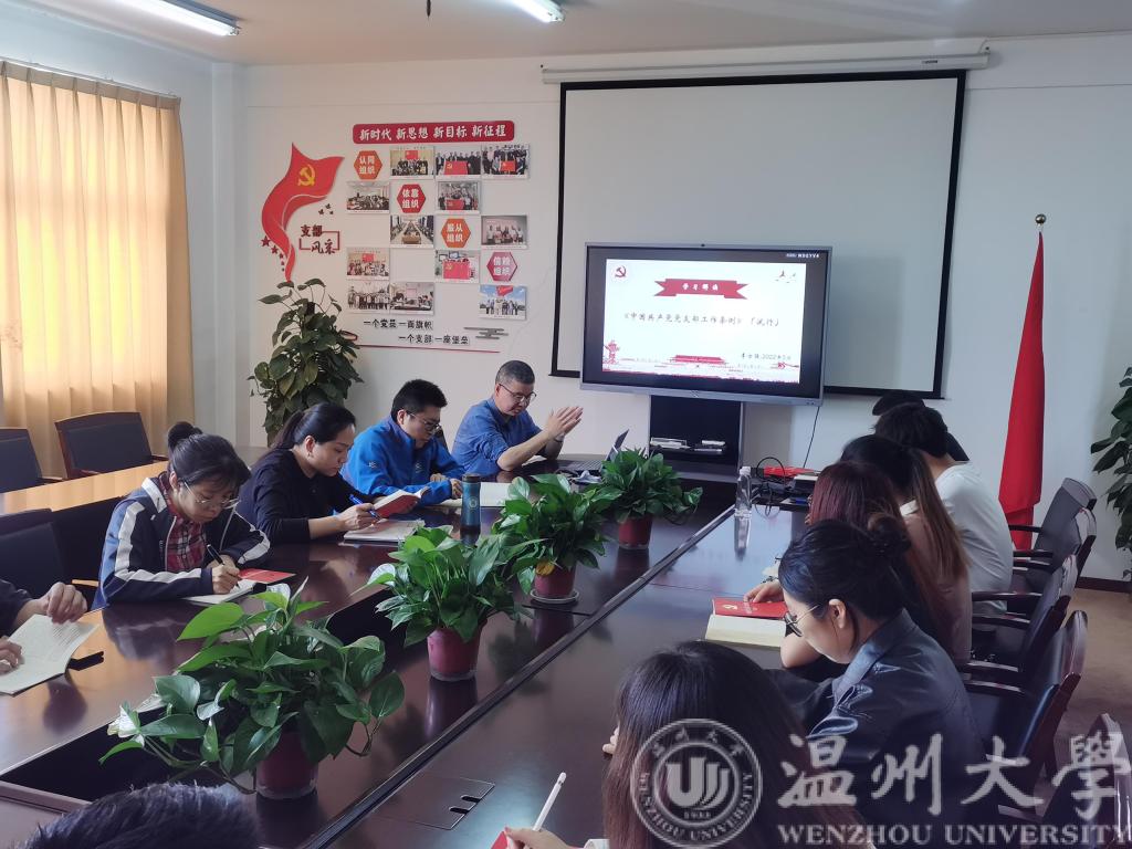 会议伊始,李书记就《条例》的出台背景、过程和意义,做了详细的说明。李书记指出,《条例》的制定和实施,对于加强党的组织体系建设,全面提升党支部组织力、强化党支部政治功能,充分发挥党支部战斗堡垒作用,巩固党长期执政的组织基础,具有十分重要的意义。紧接着,李书记就《条例》的主要内容分块进行了详细的解读,包括明确的党支部功能定位、党支部的设置、党支部的基本任务和不同领域党支部的重点任务、党支部的工作机制、党支部组织生活、委员会建设和党支部工作的领导指导责任等方面。李书记对每一章条例作了解读和说明,并附以实例进行说明,阐释了高校党建工作内容以及党支部工作机制和任务。其中,组织生活是党支部对党员进行教育管理的基本方式,李书记着重展开介绍了党支部组织生活的基本形式,包括“三会一课”、主题党日、组织生活会、民主评议党员、谈心谈话等。从对组织生活的概念厘清上,提出对党支部工作的要求,真正做到理论学习和政治教育。