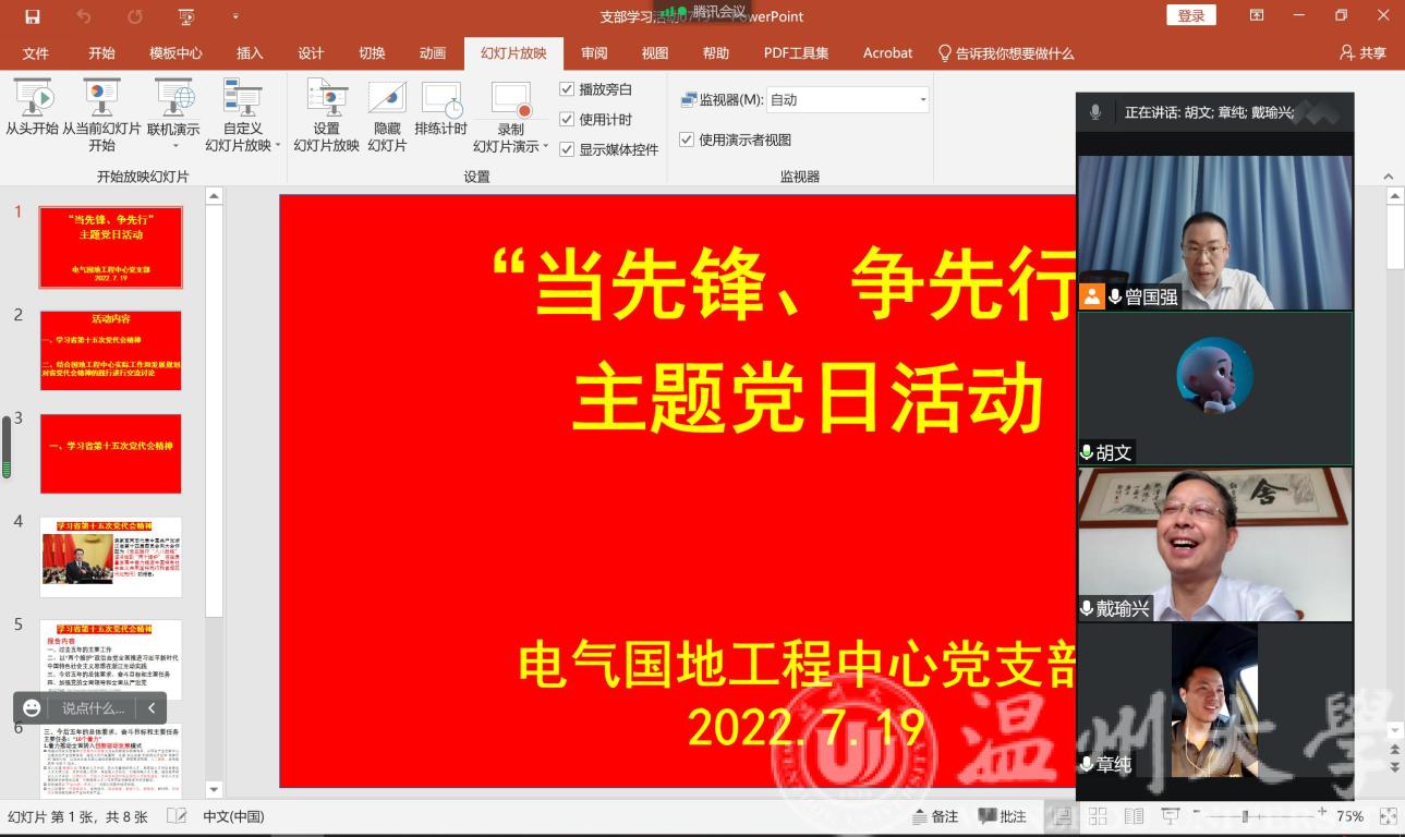 电气国地中心党支部线上学习了省第十五次党代会报告《忠实践行“八八战略” 坚决做到“两个维护” 在高质量发展中奋力推进中国特色社会主义共同富裕先行和省域现代化先行》的主要内容,重点解读了今后五年主要任务中的“着力推动全面转入创新驱动发展模式”。会上,支部全体成员结合国地工程中心的实际工作和发展规划,对省党代会精神的践行进行了交流讨论。大家主要围绕国地工程中心科研平台的升级、人才培养、科研方向规划与凝练、重点领域攻关等方向深入交流和讨论分析。电气国地工程中心主任戴瑜兴教授在交流讨论中表示:“国地工程中心近年来在新能源、综合能源系统、海工高端装备、数字电网等多个重点领域提前布局和重点发力,取得了一系列有影响力的高质量科研成果。今后五年工程中心将继续围绕省党代会提出的着力方向进行重点攻关,在科研平台建设、人才培养和科研成果培育方面继续努力。支部应团结一致,继续发挥战斗堡垒作用,党员同志应积极争当先锋,为两个先行的实现做出更多更大的贡献!”
