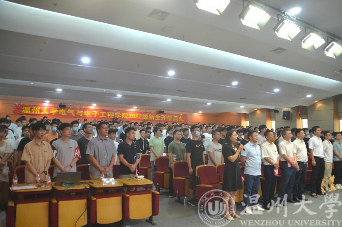 13:30,开学典礼正式开始。学院党委副书记曾蓓蕾首先表达了对学院注入新鲜血液的激动和疫情严峻形势下开学典礼如期举行的欣慰,随后向22级新同学们分别介绍了出席的学院领导、老师以及学生代表们,并欢迎他们的到来,开学典礼正式开始。随后,全体起立,奏唱国歌。