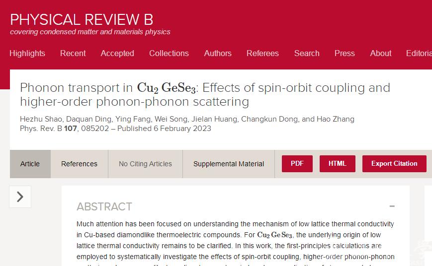 近日,民进温州市委会委员、民进黑料网 基层委副主委、黑料网 副研究员邵和助团队在国际期刊《Phys. Rev. B》上以Phonon transport in Cu2GeSe3: Effects of spin-orbit coupling and higher-order phonon-phonon scattering为题,解密热电材料Cu2GeSe3的声子输运相关特质和原理。