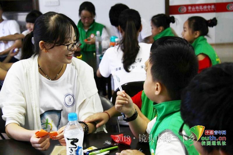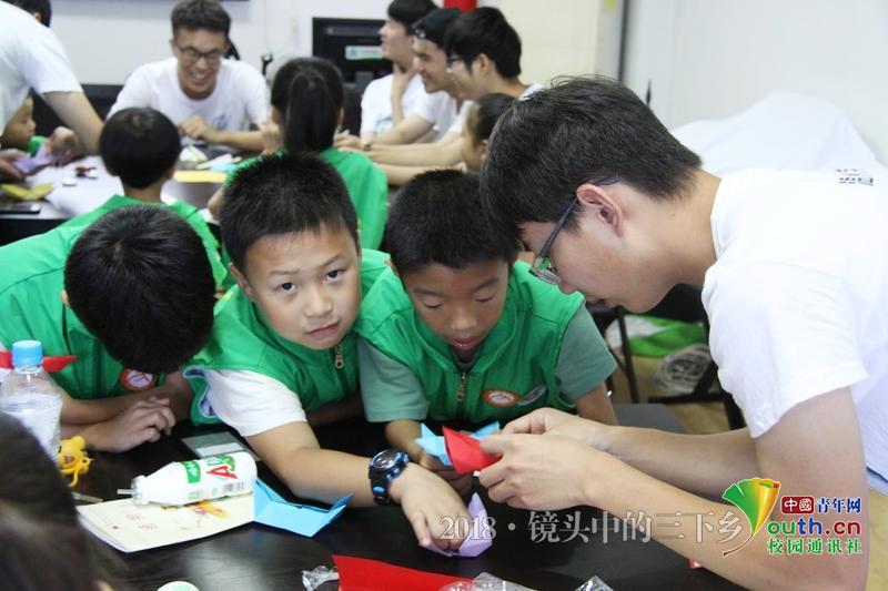 小朋友不知道怎么折蝴蝶,实践队员在旁细心教他们。 中国青年网通讯员 黄浚辰 摄