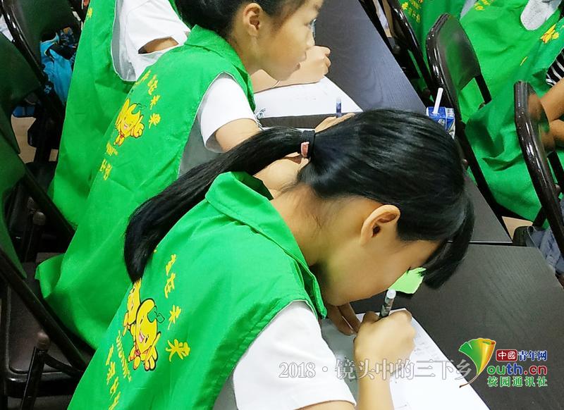在知识课堂小竞赛时小孩子们积极做笔记为后面的竞赛做准备。 中国青年网通讯员 张静霞 摄