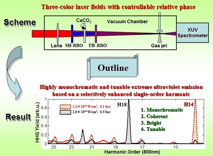 可调谐单色相干光源的产生方法一般是通过晶体的倍频或差频来产生,输出的波段多见于紫外-红外波段,在极紫外波段(100~10nm)很难使用上述方法产生。但极紫外光源在现代生产和科研中有着极其重要的应用。因此有必要采用新的方法和新的手段来产生这种极紫外波段的单色相干光源。最 近,黑料网 尉鹏飞老师与中科院上海光机所的李儒新教授密切合作,利用飞秒激光与惰性气体相互作用产生高次谐波,然后通过宏观相位匹配和原子内相位匹配技术将 高次谐波频率梳中的能量集中调谐到某个特定阶次,使其只输出某个节次的特定高次谐波,这个特定高次谐波还能通过相位匹配技术进行调谐,获得的单色极紫外辐 射(XUV)在强度和对比度上表现均很优秀。这种方法在国际上首次被提出,实验结果优异,获得三个审稿人的一致肯定。该研究工作发表在最近出版的《物理评论快报》上(Phys. Rev. Lett. 110, 233903, 2013).