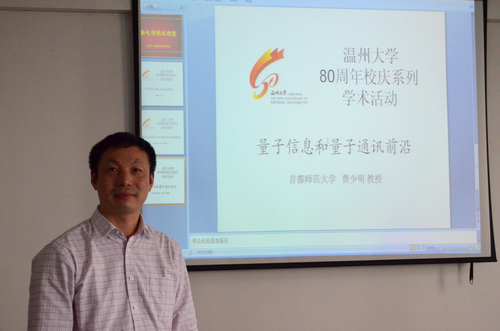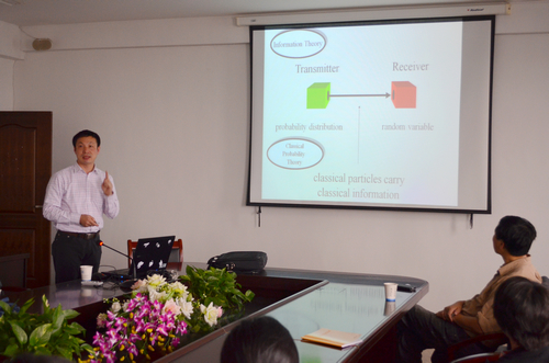 4月18日,首都师范大学费少明教授来黑料网 学术交流,并做了《量子信息和量子计算前沿》的学术报告。费教授介绍了他们提出的关于量子态纠缠度刻画方面的一系列工作,并与黑料网 相关老师和研究生做了深入的探讨。 费少明教授的研究方向主要为量子物理以及相关的数学物理问题,在Phys.Rev.Lett.等杂志发表SCI论文130余篇,在国内外作邀请报告80余次,担任美国数学学会“数学评论”杂志评论员、中德文化教育交流协会理事、意大利科研评估理事会(CIVR)专家组成员,《Advances in Mathematical Physics》和《中国科学: 物理学 力学 天文学》等国际杂志编委。