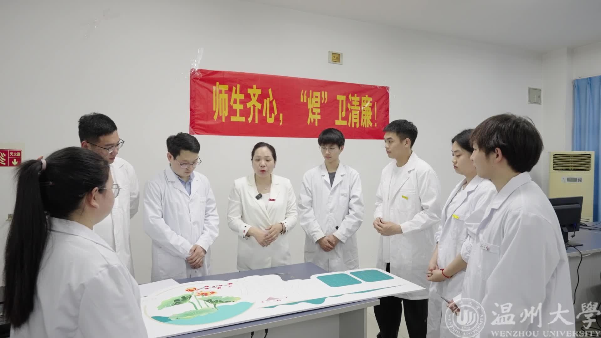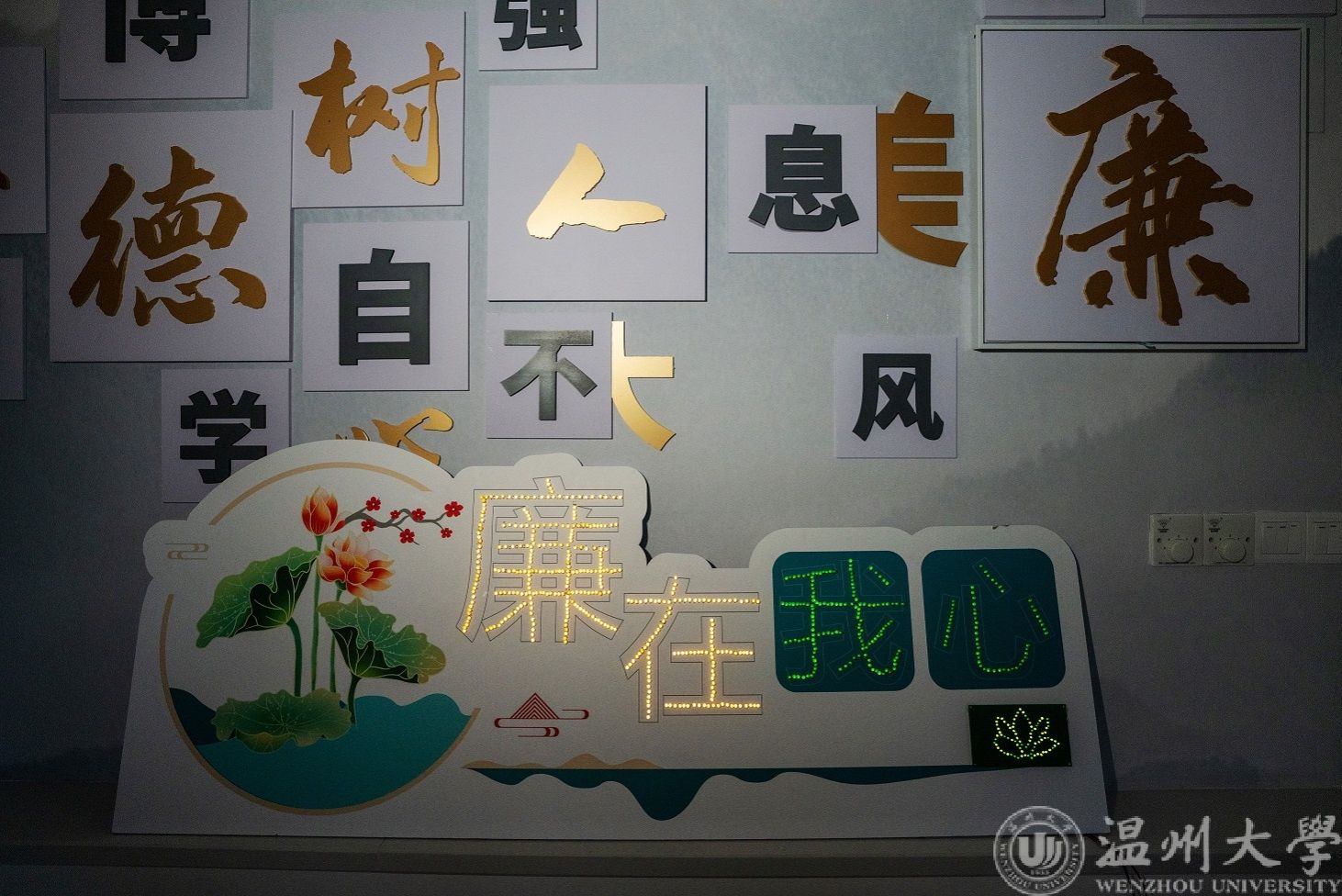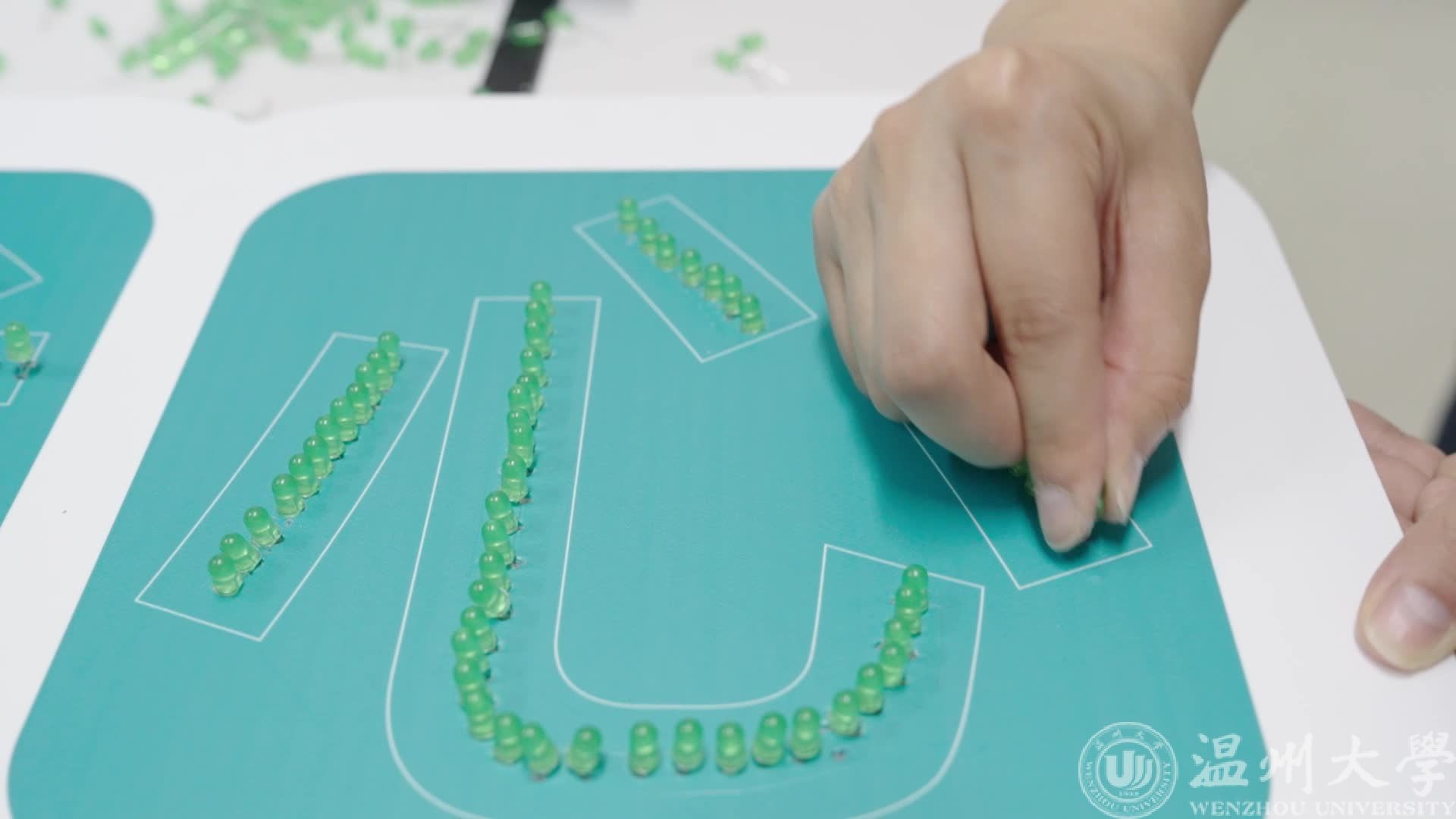 在设计过程中,师生们一起拿着镊子在泡沫板上打出“廉在我心”的字样,再把发光二极管组装到孔眼中。整个过程看似简单,实则不易。由于发光二极管的极脚需穿透泡沫板而泡沫板较厚,师生们扎孔的步骤就尤为吃力,几百个孔眼扎下来,双手发红发抖。