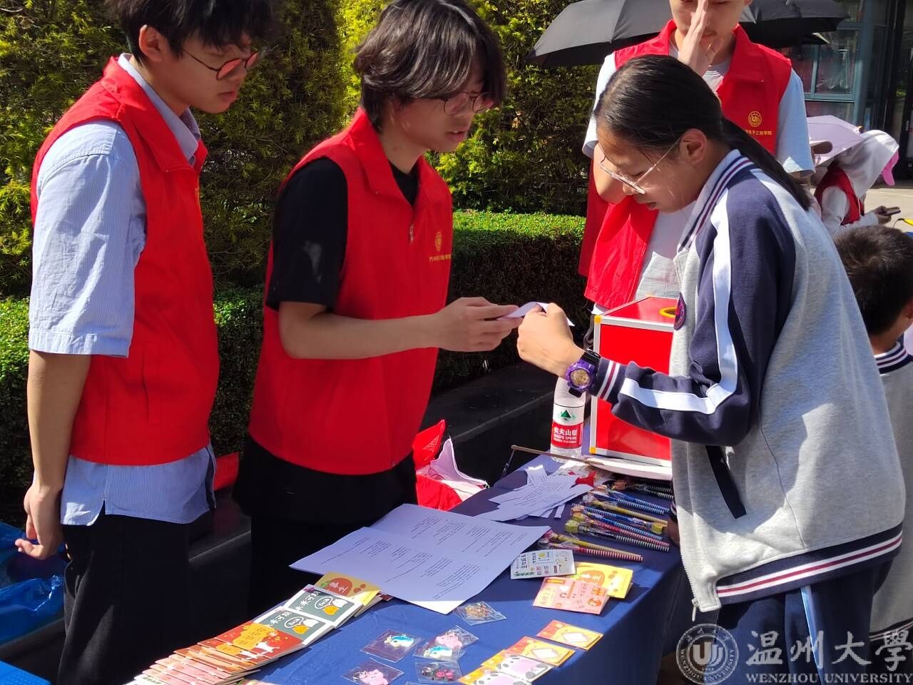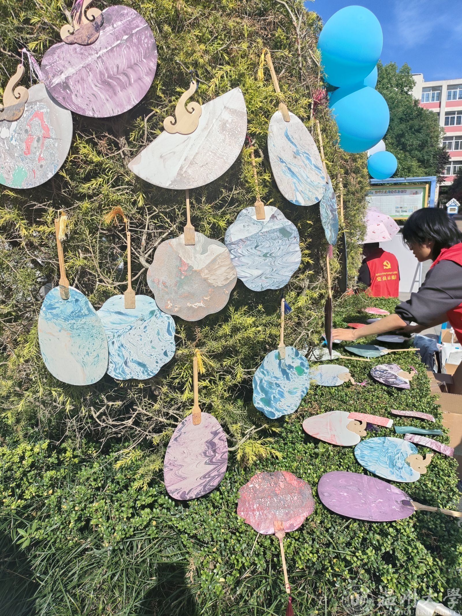 此外,本次集市活动还将“非遗”和“劳动”相结合,带给同学们无与伦比的文化体验。在漆扇制作摊位,志愿者们带领同学们感受漆扇的制作过程,体验漆扇之美;在剪纸摊位上,同学们加入了自己的创意和想象力,创作出独具特色的窗花作品;在插秧体验摊位,温大励行劳动工作室的志愿者把活动现场“变身”秧田,学生们在“自留地”上又快又准地将道具“秧苗”插入“田地”,体验农耕文化,感受劳动之艰辛。