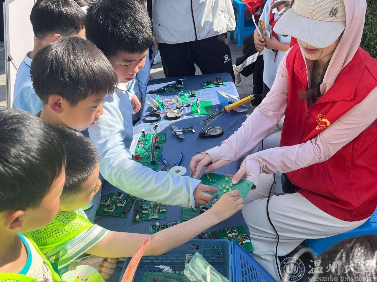 元器件文创体验组向同学们展示了电子元器件工艺品,并普及了科学小知识。创新之道,惟在得人,“原来小小的电子元器件,有着大大的功能,我们的生活都离不开他们,”孩子们看到电子元器件兴奋地说。在大学生志愿者们的指导下,孩子们拿起电烙铁,沉浸式地体验了一把“电焊师”的感觉。