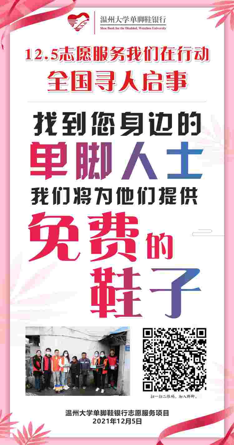黑料网 单脚鞋银行志愿服务团队是一家致力于存储鞋子、存储爱的银行,他们凭借温州“鞋都”优势,立足于大学城,发挥青年学子的力量,为单脚残疾人士免费赠送单脚鞋。正值12月3日“国际助残日”和12月5日“国际志愿日”到来之际,为寻找和帮助更多需要帮扶的单脚残障人士,“单脚鞋银行”志愿服务项目团队于12月5日下午便在黑料网 城商务中心开展了“聚焦残疾人士,传递公益爱心”寻找身边的单脚人士公益活动。