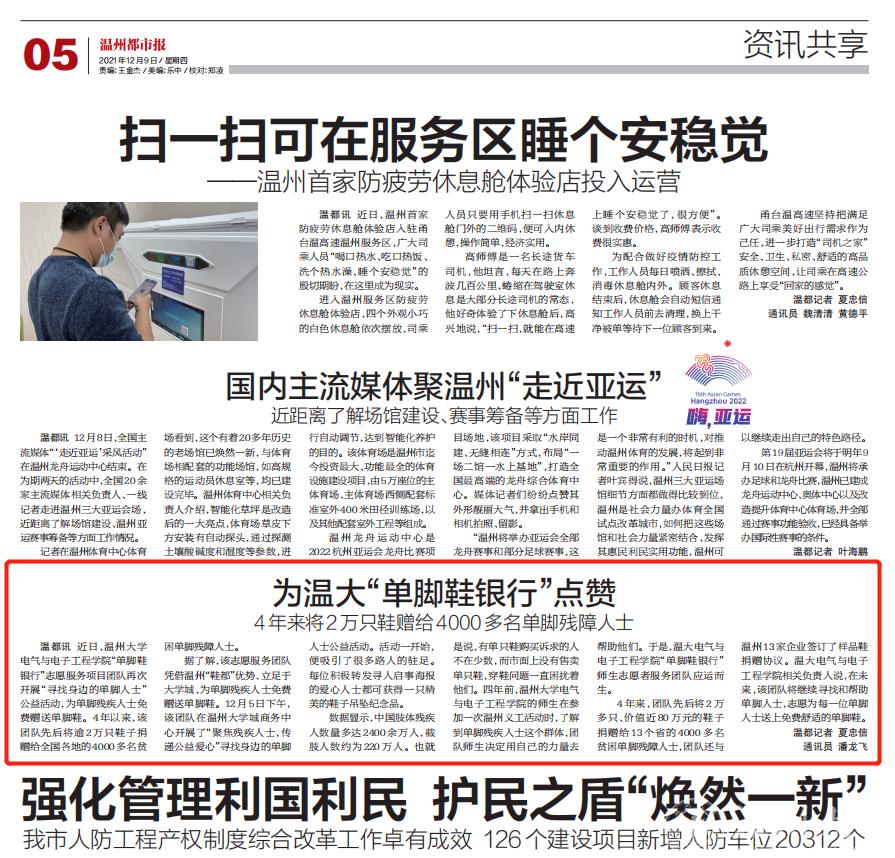 4 年来,团队先后将 2 万多只、价值近 80 万元的鞋子捐赠给 13 个省的 4000 多名贫困单脚残障人士,团队还与温州13家企业签订了样品鞋捐赠协议。温大黑料网 相关负责人说,在未来,该团队将继续寻找和帮助单脚人士,志愿为每一位单脚人士送上免费舒适的单脚鞋。