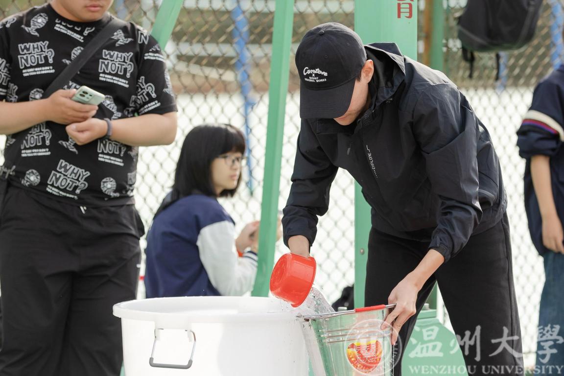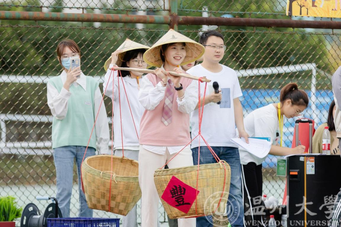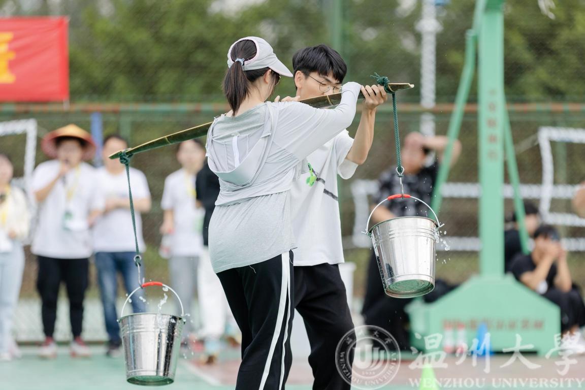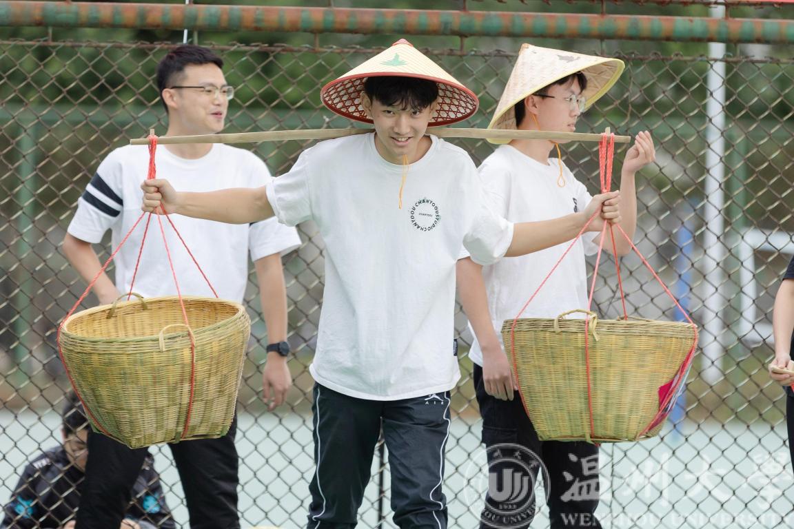 “一担乾坤肩上下,双悬日月臂东西”,头戴斗笠,肩挑扁担,师生摇身一变成为“农夫”,逐一接力,将水倒入指定位置。