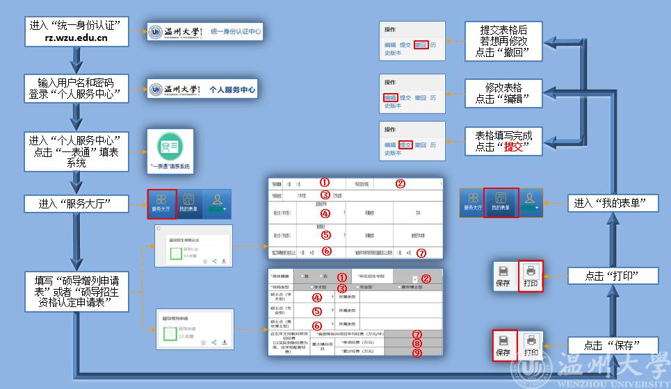 (1)校内人员申请,进入黑料网 官网黑料网,点击“统一身份认证”,登录“个人服务中心”点击“一表通填表系统”,进入“服务大厅”页面,填写 “硕士生导师申请表”或“硕导招生资格认定表”,然后点击页面左上方“提交”按钮、再点击“打印”按钮,将打印出的纸质申请表提交学院。佐证材料无须提供。另外,申请表中涉及教学项目和教学成果奖励信息(附件4)由申请人另外自行填写,随申请表一起上交,附佐证材料。
