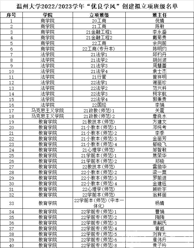 根据《关于申报2022/2023学年“优良学风班”立项活动的通知》,经班级申报、学院初审推荐、学生处审核,决定对20工商等146个班级进行立项,现将结果予以公布。