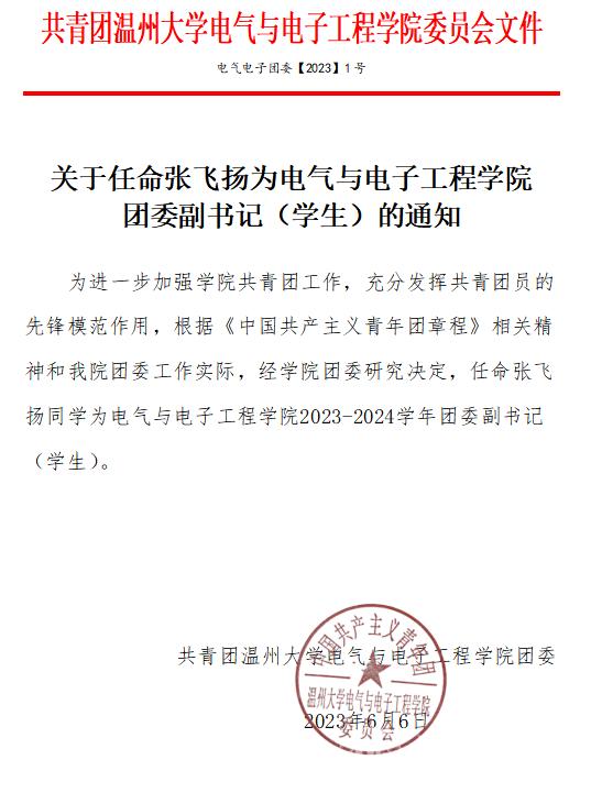 关于任命张飞扬为黑料网 团委副书记(学生)的通知