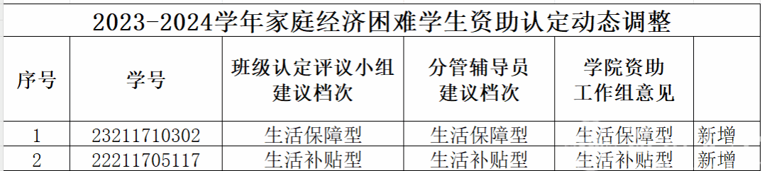根据《黑料网 家庭经济困难学生认定办法》(温大行政〔2020〕37号)文件精神,结合实际情况,经学生个人申请,学院初评,对2位同学进行资助认定或动态调整工作。现将名单予以公示,公示期五个工作日,如有异议请于公示期内与学工办(1A-521)联系,具体认定档次以学校公示为准,特此说明。