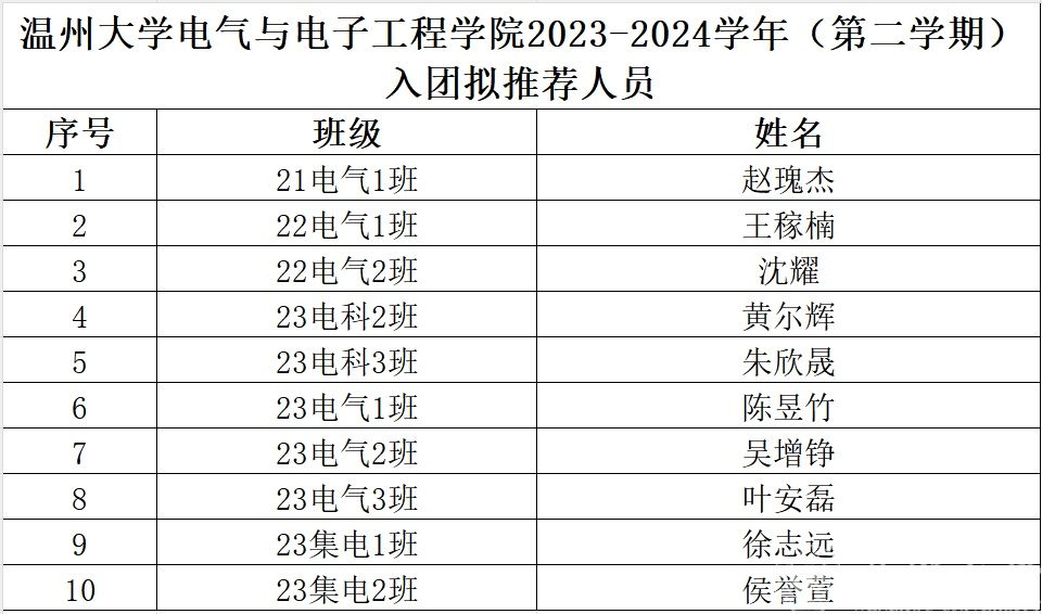 根据《中国共产主义青年团章程》、《关于做好 2023-2024 学年第二学期团员发展与管理工作的通知》等文件精神,经学生申请、材料审核、投票评选,共评选出赵瑰杰等10名同学为本学期入团拟推荐人选,现将拟推名单予以公示。