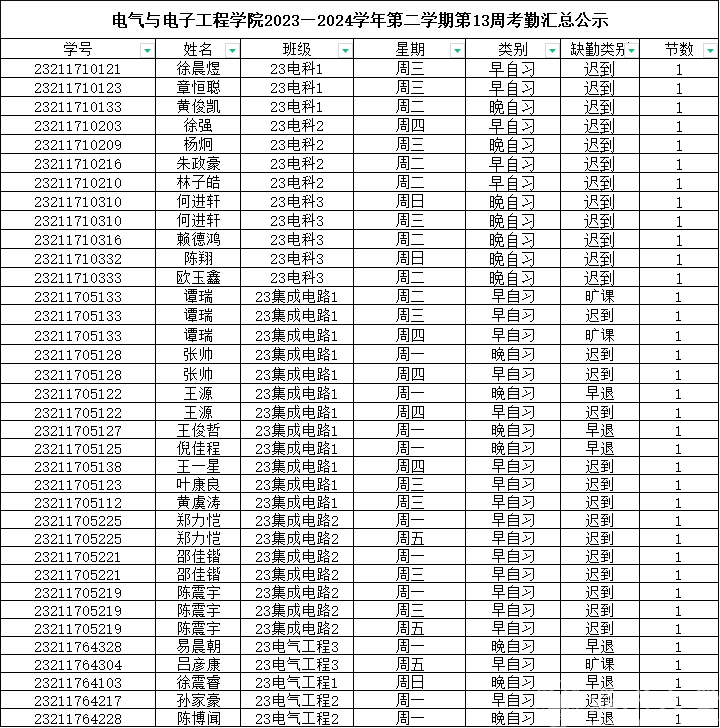 第十三周早晚自习缺勤及课堂出勤情况如下: