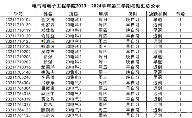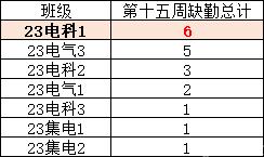 第十五周早晚自习缺勤及课堂出勤情况如下: