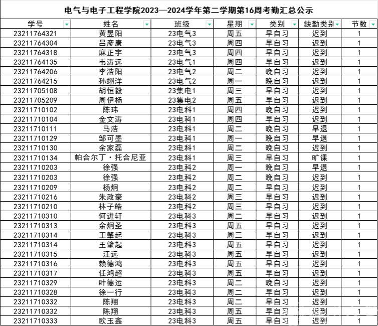 第十六周早晚自习缺勤及课堂出勤情况如下: