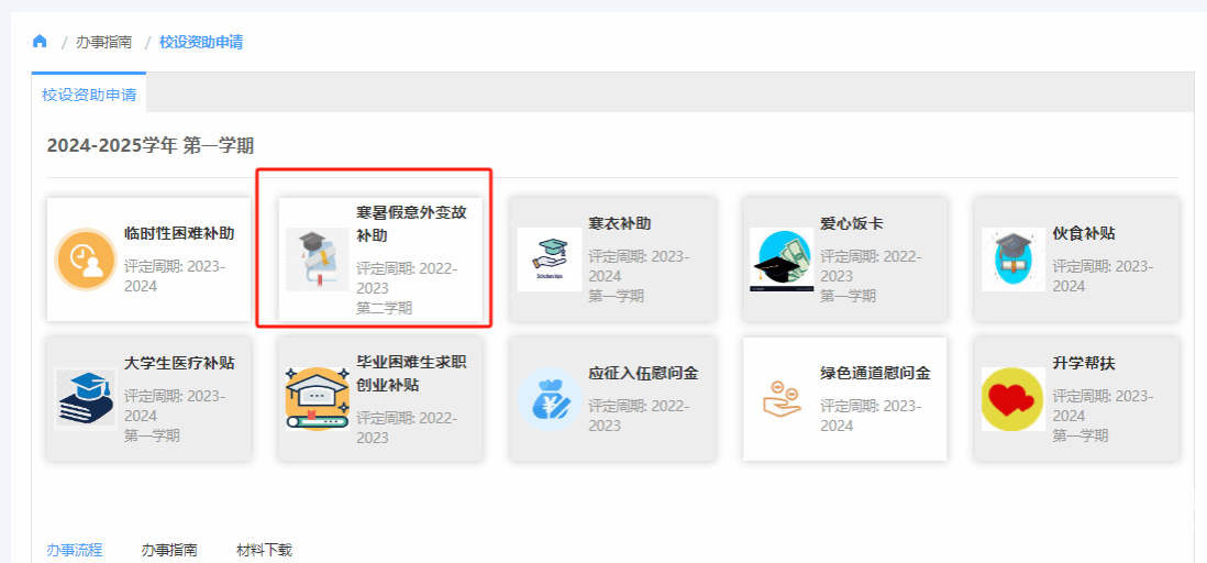 1.“暑期意外变故补助”仅限在今年(2024年)暑假期间发生的意外变故申请。学生申请步骤:学生登陆学工系统-服务大厅-校设资助申请-选择“寒暑假意外变故补助”-填写申请金额、理由、本人的中国工商银行卡卡号并上传相关支撑材料的照片-提交-学院审核-学工部审核。