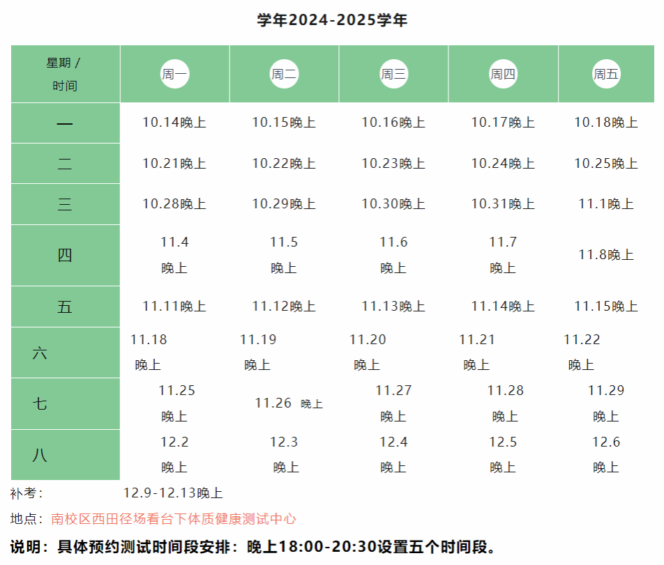 1、 学生体质健康测试中心在南校区西田径场看台下,请大家测试时前往南校区体测中心!