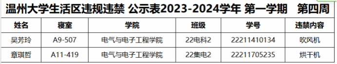 自2023-2024学年第一学期入学开始,学校针对宿舍安全进行大排查。根据学校第四周寝室安全卫生检查结果,第四周排查到2位同学存在寝室违规现象,受到学校通报;现根据学校相关规定,对上述同学进行院内通报批评,请其他同学引以为戒(名单见下)