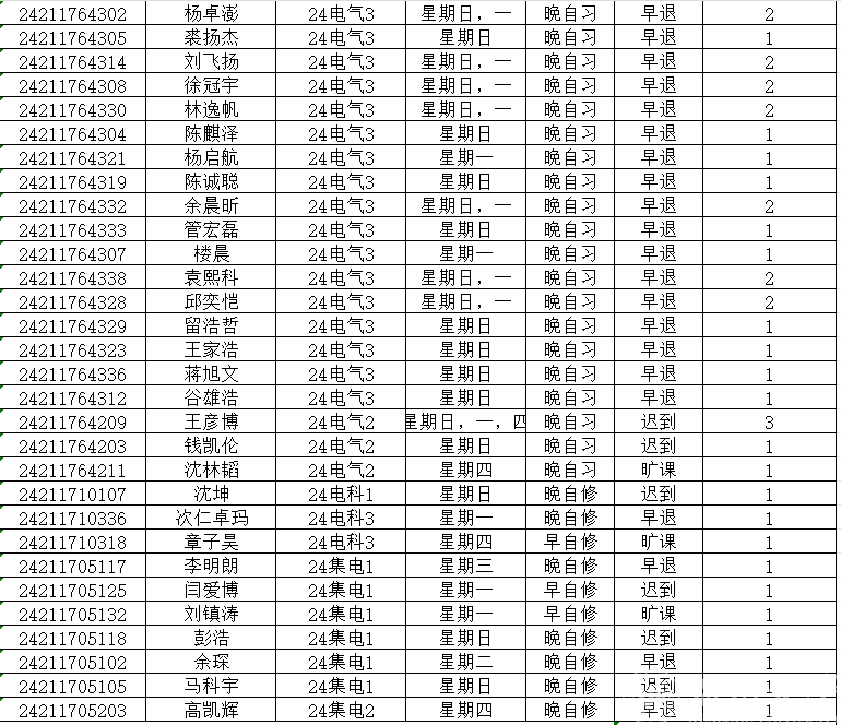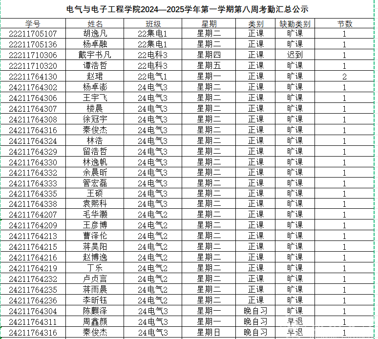 第八周早晚自习缺勤及课堂出勤情况如下: