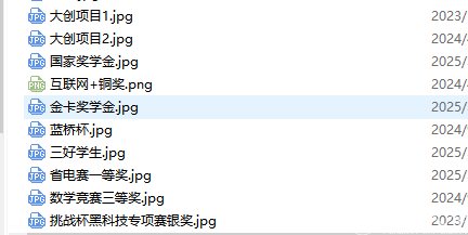 ③-证明材料:申报表及汇总表中涉及的奖状、项目、竞赛、科研等相关证明材料,整理到一个文件夹内,相关文件命名为奖项或项目名称,如下图所示: