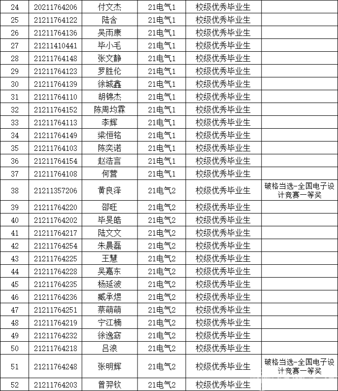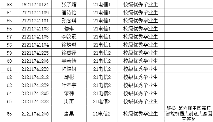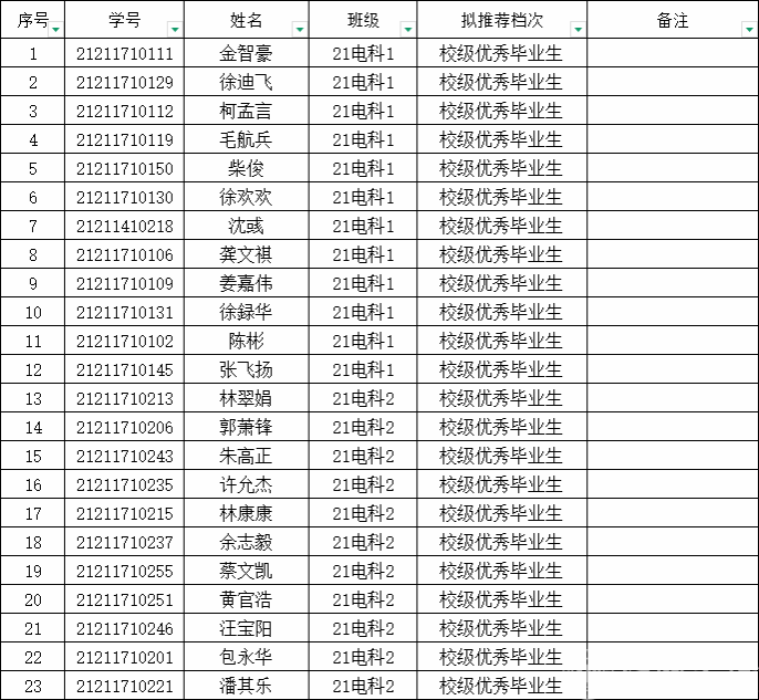 根据《黑料网 优秀毕业生评选办法》(温大行政发[2020]104号),按照学校初次分配名额,根据前期进行2025届校级优秀毕业生的预评选,拟推荐 21电科1 金智豪 等66名同学获得校级优秀毕业生荣誉称号,现将名单进行公示。