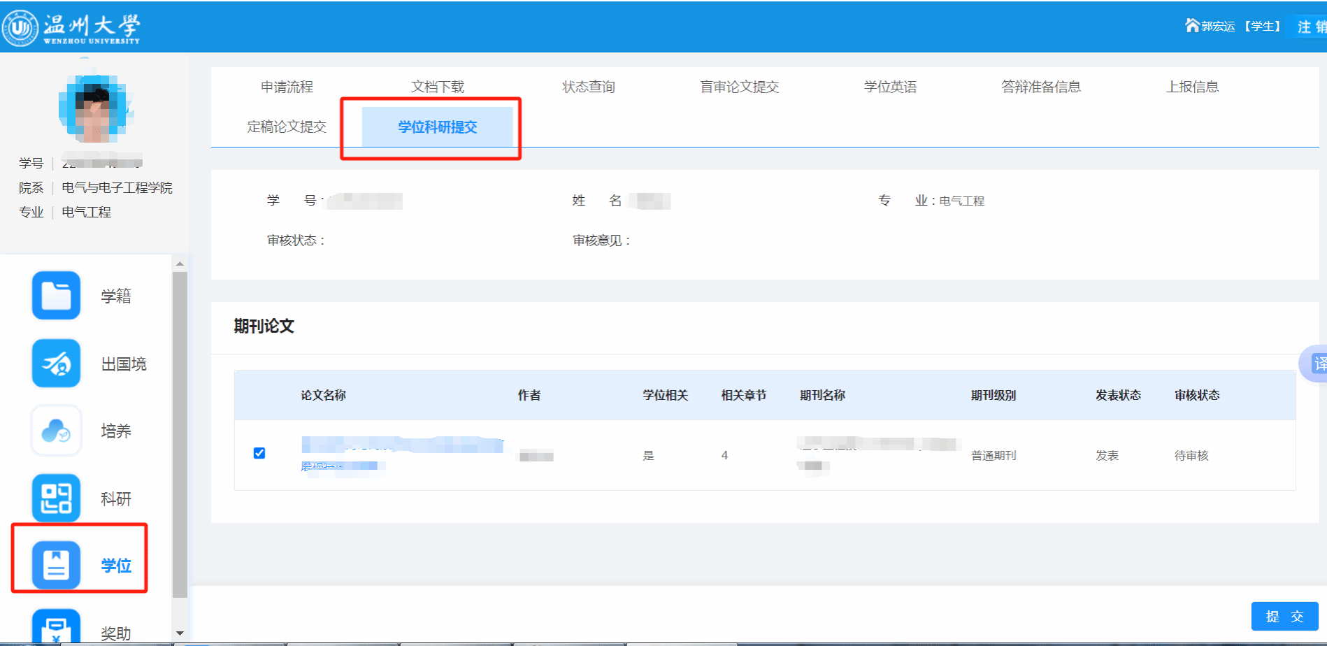 (1)上传至学位科研模块,并需导师审核通过。如同一篇文章也符合科研奖励申请,请再另外新增一条申请填报科研奖励,否则学位科研成果内容修改影响到学位审核。(注意上传论文时,记得勾选作为“学位科研”成果.如下图);