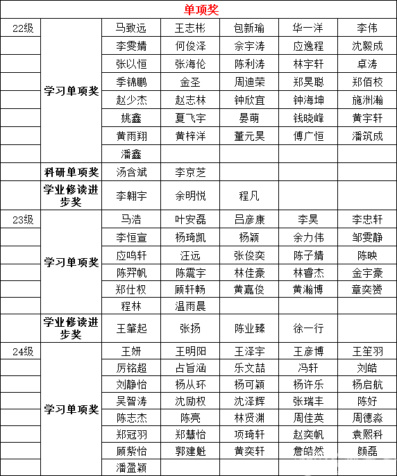 根据《黑料网 奖学金实施办法》、《黑料网 学生综合素质考评实施办法》、《黑料网 三好学生评选办法》进行2022级、2023级、2024级学生2024-2025学年奖学金以及三好学生评选。经学生个人申报、附加分申报与审核、综合测评成绩核定、班级范围公示反馈等程序,拟评定李苏等268人为2024-2025学年校级综合奖学金获得者,拟评定马致远等108人为2024-2025学年单项奖学金获得者;拟授予丁雨鑫等130人2024-2025学年“三好学生”荣誉称号。现将名单予以公示,请班级以及个人认真核对。