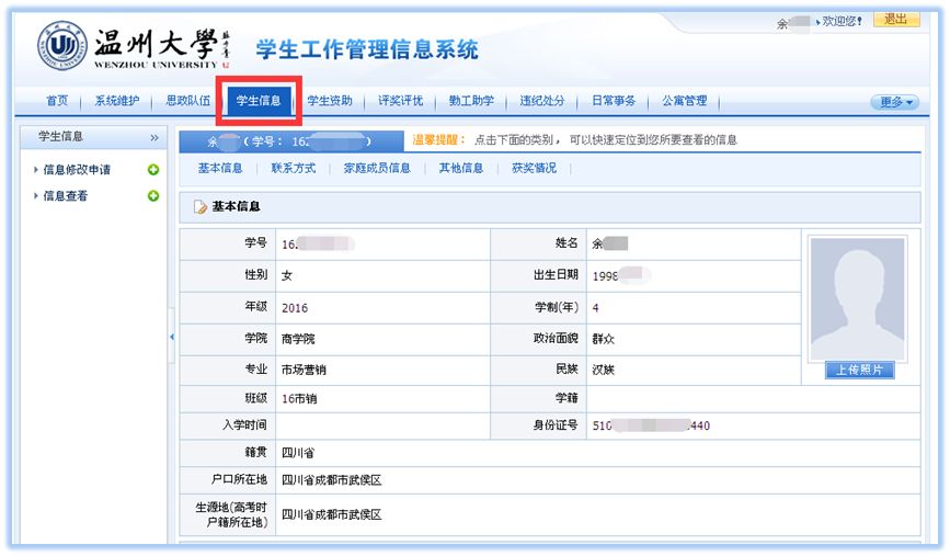 2、新生个人信息从迎新系统中新生个人信息同步,如有发生变化的内容(如个人联系方式、工行卡号),请务必更新。
