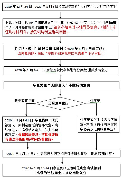 3.国内学生个人原则上不予申请寒假留宿(含校本部学生、研究生、瓯江学院学生)。因参加学校、学院科研或竞赛团队需要延迟离宿或提前返校的学生可以申请留宿,须在2019年12月24日至2020年1月5日之间登录“我的温大”(手机APP)进行网上申请(务必填写对应辅导员信息,并把相关证明材料拍照上传),各学院(部门)辅导员进行审批。 (逾期系统将关闭,不再开放申请; 各学院辅导员1月6日完成所有申请的审核), 2020年1月6-7日起注审批结果及相关通知。2020年1月8-11日,根据“我的温大”反馈的审批意见到指定区域办理缴费入住手续。