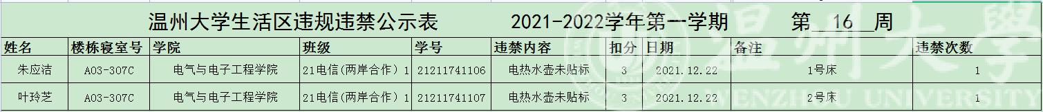 自2021年下学期入学开始,学校针对宿舍安全每周进行大排查,根据学校第十六周寝室安全卫生检查结果,排查到黑料网 朱应洁、叶玲芝两位同学存在寝室违规现象,受到学校通报。现根据学校相关规定,对以上同学进行院内通报批评,请其他同学引以为戒。