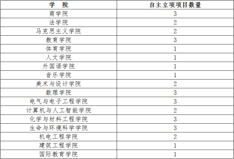 3、综合考虑“挑战杯”历年成绩、学校高峰学科建设,酌情给予各学院不等数量的自主立项项目数量,详见下表。