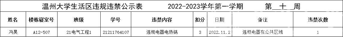 自2022-2023学年第一学期入学开始,学校针对宿舍安全每周进行大排查,根据学校第十周寝室安全卫生检查结果,排查到1位同学存在寝室违规现象,受到学校通报。现根据学校相关规定,对上述同学进行院内通报批评,请其他同学引以为戒(名单见下)