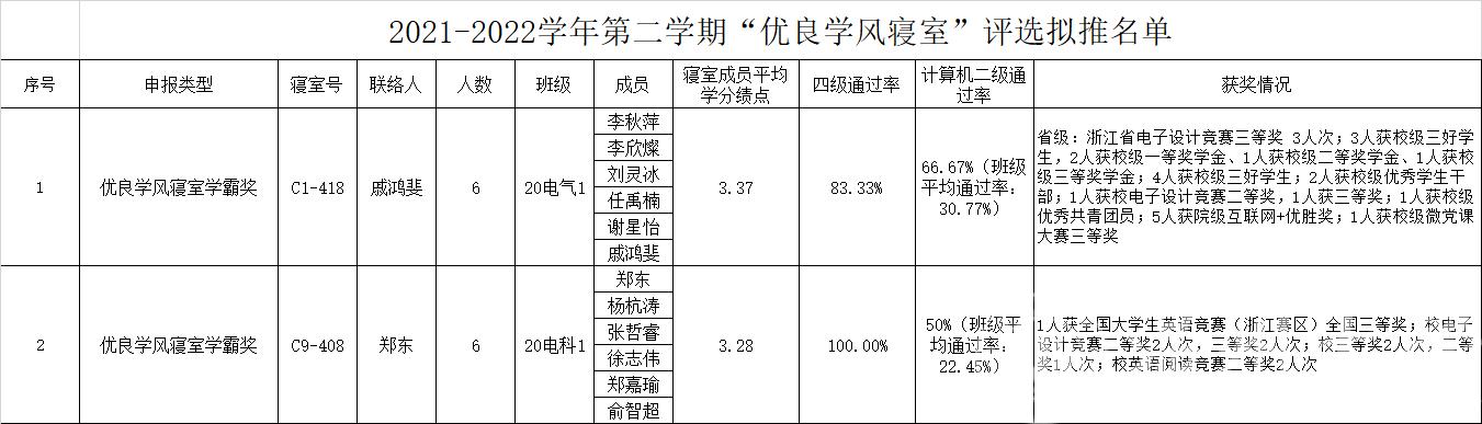 为进一步加强院风学风建设,发挥优秀寝室树立的导向和典型作用,引导和激励广大学生刻苦学习、立志成才,根据《黑料网 优良学风寝室评选办法》规定,经各寝室申请,学院初评,拟推荐 C1-418等2个寝室获得2021-2022学年第二学期“优良学风寝室”称号。现将名单给予公示