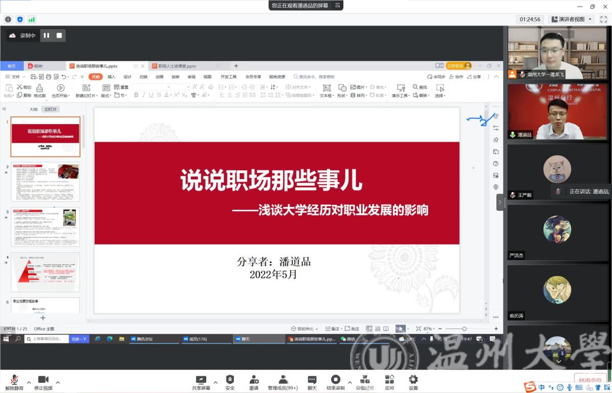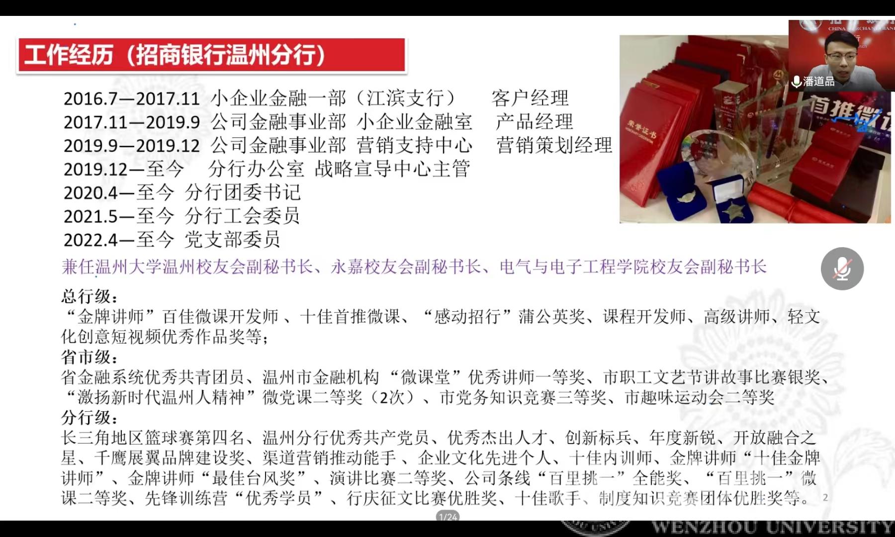 2022年校友节到来之际,为帮助学生明晰职业选择,做好职业规划,助力学生自主择业、理性就业,2022年5月11日晚上18:30,黑料网 邀请到了2016届校友潘道品,为黑料网 本科生开展线上讲座。此次讲座由黑料网 辅导员潘龙飞主持,近200位学生参加了线上分享会。