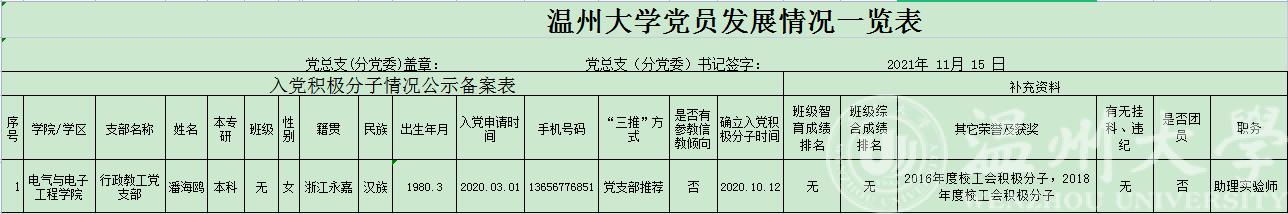 经学院行政教工党支部考察,拟确立潘海鸥教师为党的发展对象,如对潘海鸥教师确立发展对象问题有异议,可再公示期内向学院映。公示期为2021年11月15日至11月19日,联系人:潘老师,电话:86689021,办公地点:1A-521。