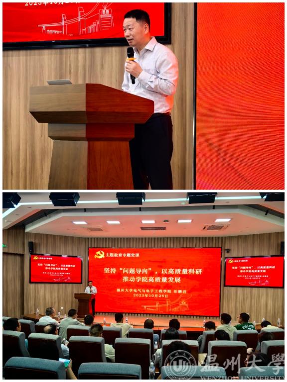 “今天我们来到乐清市正泰物联网传感产业园看发展、学思想、促行动,把主题教育专题党课搬到基层一线,就是要用习近平新时代中国特色社会主义思想指导实践、推动工作,以高质量党建引领推动学院高质量发展。”随后,黑料网 院长、党委副书记汪鹏君在正泰物联网传感产业园1号楼3楼报告厅给全体教师党员带来了一堂题为“坚持‘问题导向’,以高质量科研推动学院高质量发展”的主题教育专题党课。他表示,站在新的历史起点上,学院将积极发挥智力和人才优势,坚持创新驱动,勇攀科创高峰,培育优秀人才,在大力推进乐清电气产业集群高质量发展发展征程上勇当排头兵。