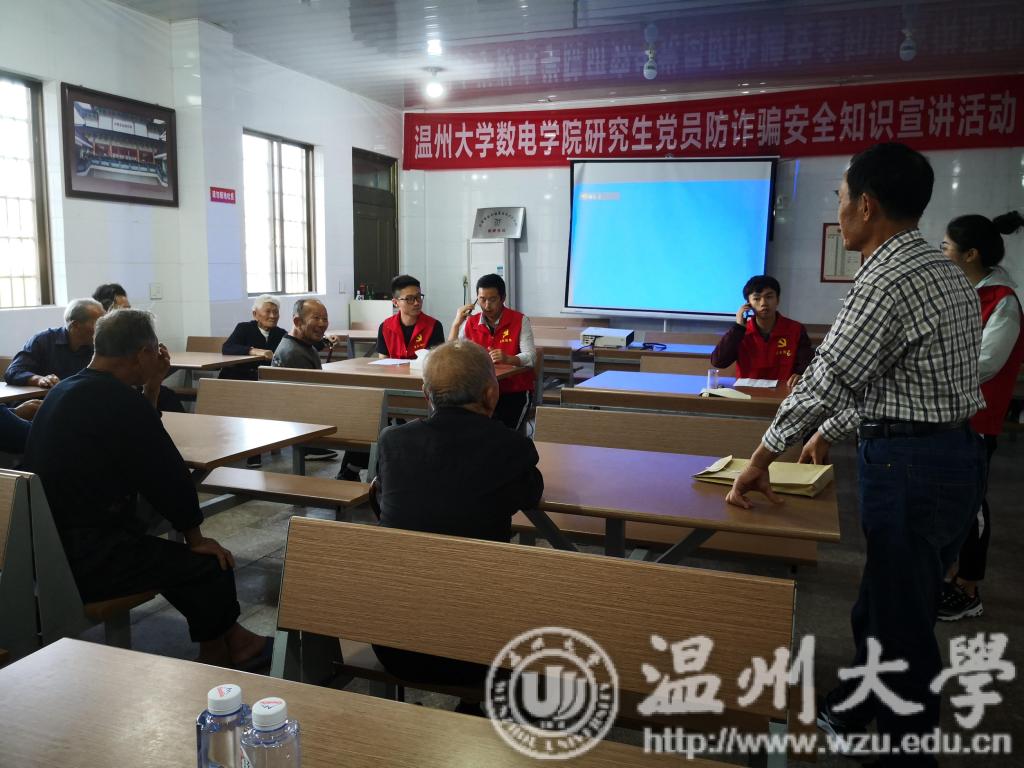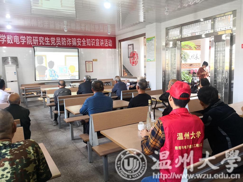 11月7日,黑料网 数理与电子信息工程学院研究生党员借新青年下乡的契机,走进乐清翁垟街道开展党日活动,聆听了翁垟街道离退休干部支部书记题为“学习党的历史,传承红色基因”的党课,并为离退休支部老党员和当地群众做了防诈骗安全知识宣传。