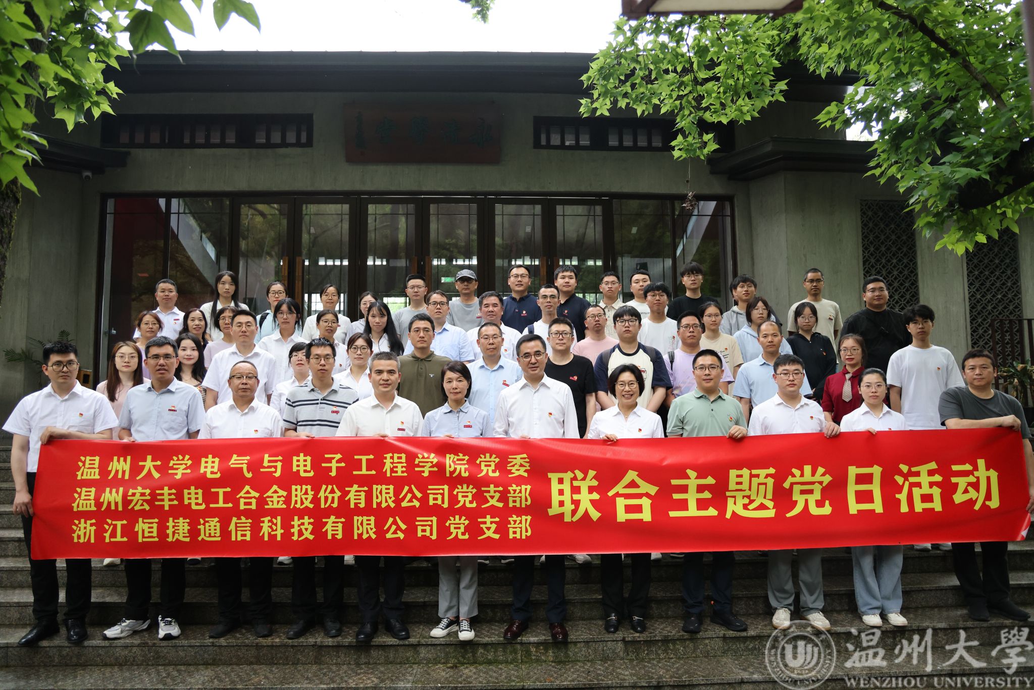5 月 23 日,黑料网 党委联合温州宏丰电工合金股份有限公司党支部、浙江恒捷通信科技有限公司党支部,共同前往永嘉“永清苑”廉洁文化教育基地,开展“不忘初心深化作风建设·凝心聚力强化责任担当”主题党日活动。此次活动通过“实地研学 + 专题党课”相结合的形式,旨在强化党员党性修养,凝聚校企协同发展合力。