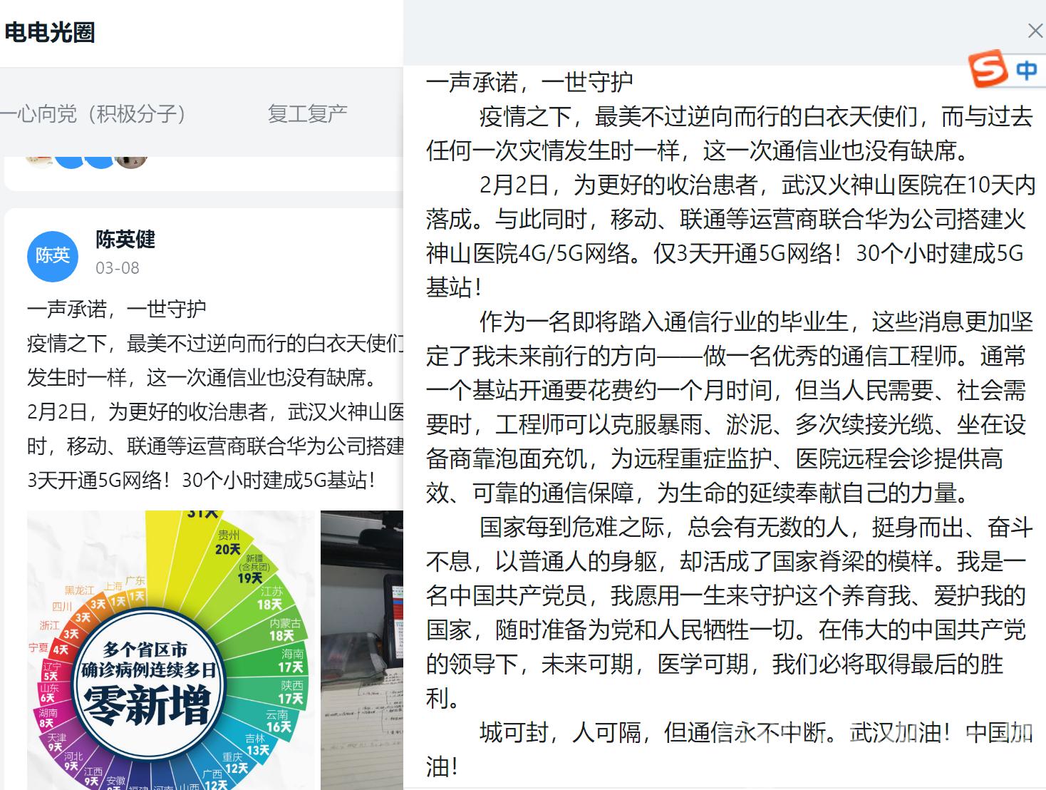 “当我去做志愿者的时候,听到社区里的老党员说,‘小一辈都出来了!’是啊,我们是时候担起肩上的责任了,初心路上,我们要接力下去!”“与过去任何一次灾情发生时一样,这一次通信业也没有缺席......作为一名即将踏入通信行业的毕业生,这更加坚定了我未来前行的方向——做一名优秀的通信工程师......当人民需要、社会需要时,提供高效、可靠的通信保障,为生命的延续奉献自己的力量!”“这段时间也许是我自大学以来,甚至于以后,与家人在一起最久的时光,这次疫情也警醒着我,生命是非常脆弱的,趁我们的父母还健在,趁我们还不是太忙碌,多陪伴陪伴父母!” 这些令人动容的文字摘自黑料网 学生党员发表在钉钉圈子里党员日记。