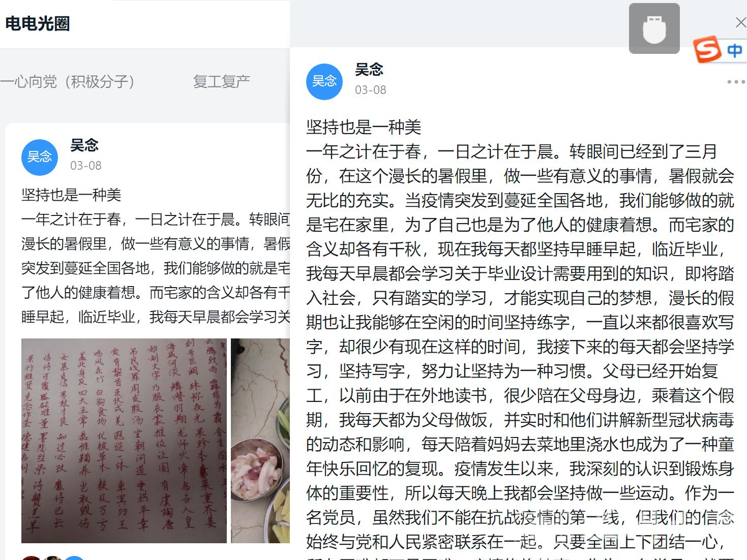 据悉,黑料网 为发挥党员先锋模范作用和朋辈引领作用,制定了学生党员战疫“123”计划,即“写好一本党员日记,用好两个云上活动馆(学习强国学习馆和钉钉群运动体育馆),办好三个空中课堂(线上课堂、支部党课、空中辅导班)”,此次党员日记活动是该学院战疫“123”党日活动计划之一,计划持续到学生返校前,或将在疫情结束后成为该学院一项党员教育管理的常态机制。