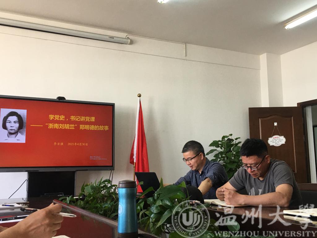活动第一项议程由行政党支部书记曾蓓蕾围绕近期支部活动开展和党史学习情况进行了总结。曾书记指出,本学期我支部“学业帮扶工程”继续加强,希望支部成员及时与对接学生联系,做好学生的学业帮扶和指导,并对接下来党员办实事活动做了具体安排。活动第二项议程党史学习交流汇报。支部党员结合《习近平在浙江》理论学习材料和近期党史学习感悟依次进行交流和分享。活动第三项书记讲党课。由黑料网 党委书记李方强为全体党员讲授党课。李书记党课题目是《“浙南刘胡兰”郑明德的故事》。李书记结合史实,讲述了年仅16岁的革命烈士郑明德被国民党抓捕,英勇不屈,最后不幸被国民党杀害的英勇事迹。“她带着对党的无比忠贞划上了生命的句号,她用殷红的鲜血写下了壮丽动人的史篇,她的故事一直在浙南地区传诵,人们称颂她是‘浙南刘胡兰’”。