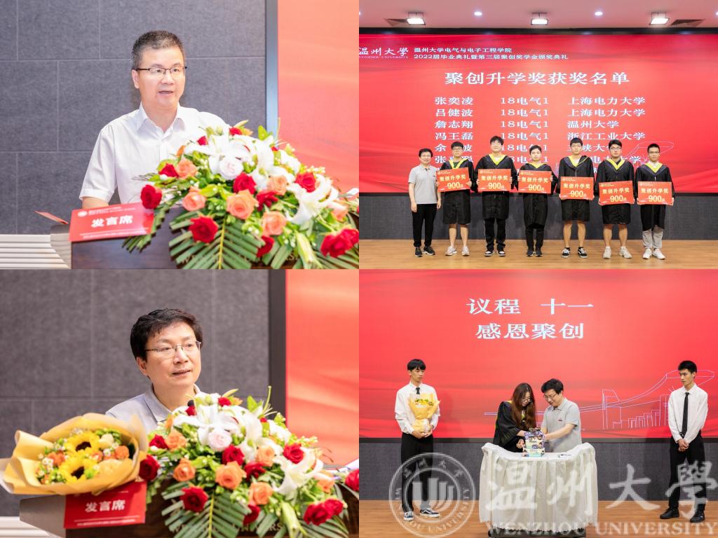 为表彰先进,在校友企业浙江聚创公司的赞助下,学院特别设立聚创奖学金。毕业典礼仪式上,学院党委书记李方强宣读了《2022年学院聚创奖学金奖励决定》文件及名单。聚创奖学金发起人吴桂初教授为获得聚创升学奖的31位同学颁奖。随后,毕业生代表任奕沛同学为吴桂初教授献花并表达感谢。